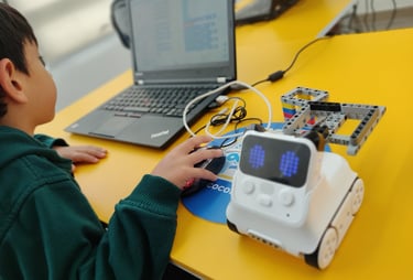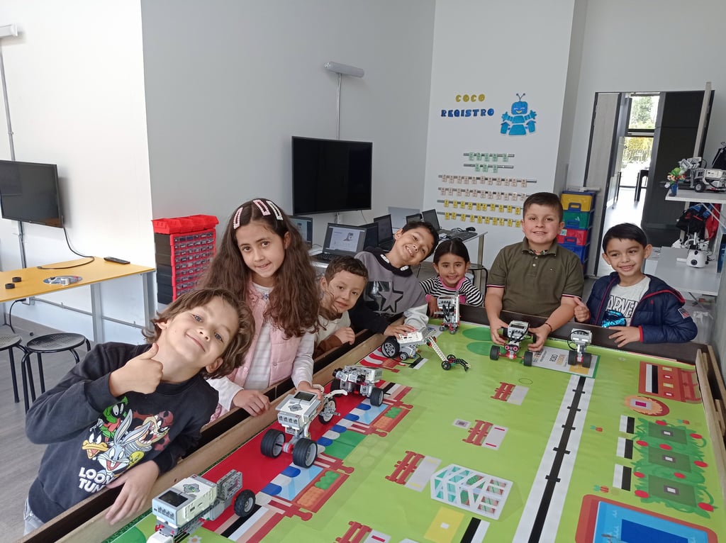 Programación de apps móviles donde los niños crean aplicaciones funcionales con bloques visuales para sus dispositivos, desarrollando juegos interactivos, controles remotos y herramientas útiles