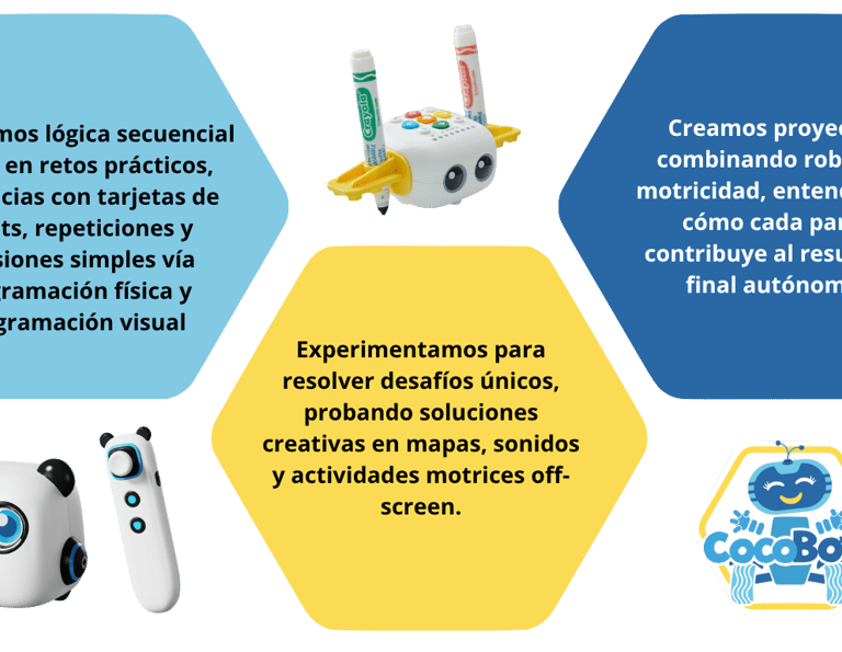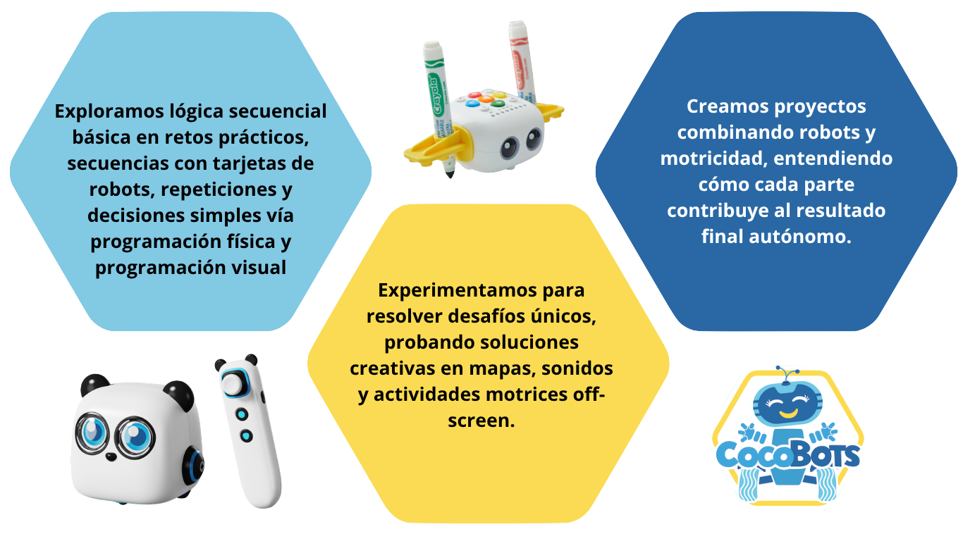 Un primer acercamiento al mundo de la robótica y el código, donde los niños desarrollan el pensamiento lógico, la creación de secuencias y la solución creativa de desafíos jugando con robots interactivos y programación visual básica, creando proyectos que fomentan la curiosidad y la resolución de problemas, sin necesidad de saber leer o escribir